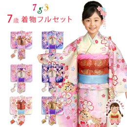 7歳女の子の七五三のお祝い用に、7種類のセットから選べるお手入れ簡単な合繊の着物のフルセット追加しました。