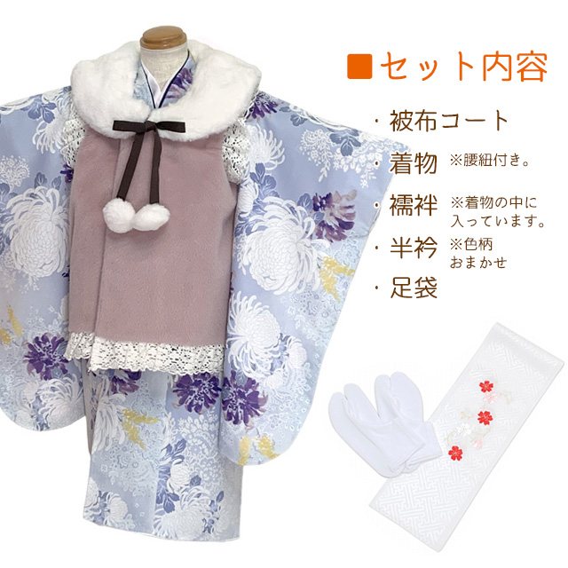 七五三 着物 3歳 女の子用 被布コート&着物5点セット レトロモダンスタイル合繊【くすみピンクxブルーグレー、菊】