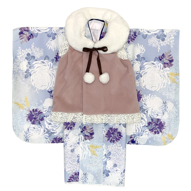 七五三 着物 3歳 女の子用 被布コート&着物5点セット レトロモダンスタイル合繊【くすみピンクxブルーグレー、菊】 [TYHFset3855-03-11]