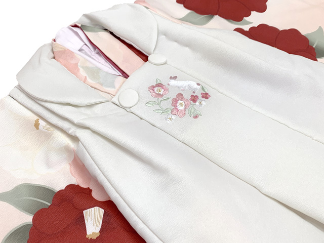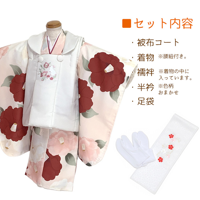 七五三 着物 3歳 女の子用 被布コート&着物5点セット レトロモダンスタイル合繊【白系xピーチスキン、椿】