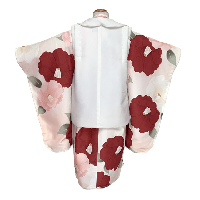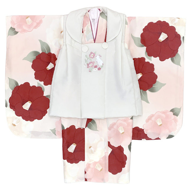 七五三 着物 3歳 女の子用 被布コート&着物5点セット レトロモダンスタイル合繊【白系xピーチスキン、椿】 [TYHFset4355-02-15]