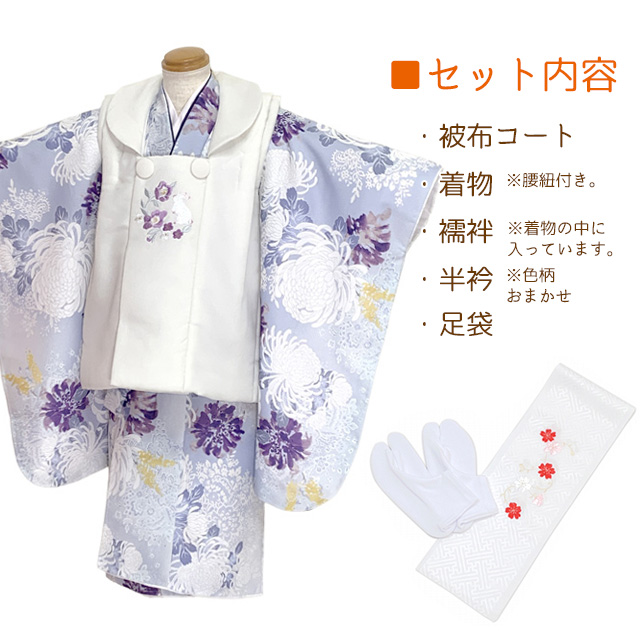 七五三 着物 3歳 女の子用 被布コート&着物5点セット レトロモダンスタイル合繊【白系xブルーグレー、菊】