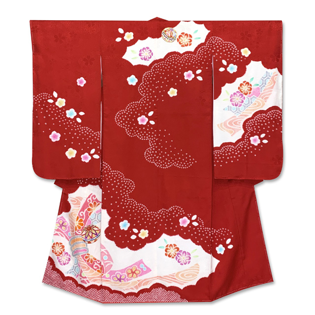 七五三 着物 7歳 フルセット 正絹 女の子 絞り染 刺繍入り 絵羽付けの子供着物 コーディネートフルセット【赤、束ね熨斗】 [IYS1015i15-18PP]
