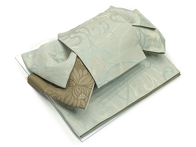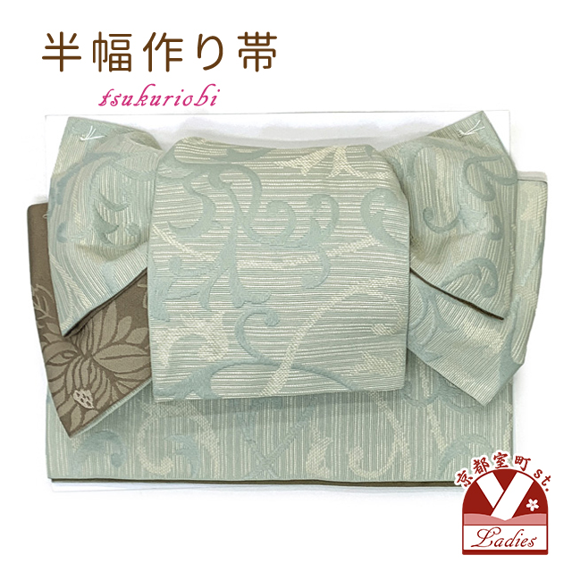 半幅帯 作り帯 リボン返し結び帯 合繊【白緑系、唐草紋】 [THM898]