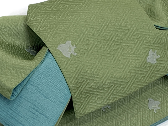 半幅帯 作り帯 リボン返し結び帯 合繊【黄緑系、紗綾がに千鳥】 [THM909]