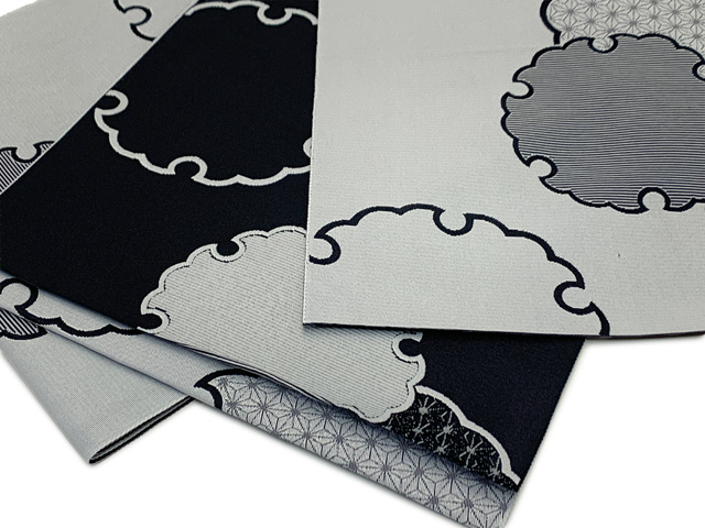 小紋の着物やカジュアルな装い向けの八寸帯です。全体がフラットな状態の開き仕立てなので、畳んで収納しやすく、前幅を自由に決められます。