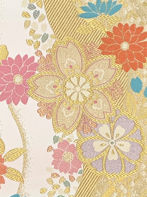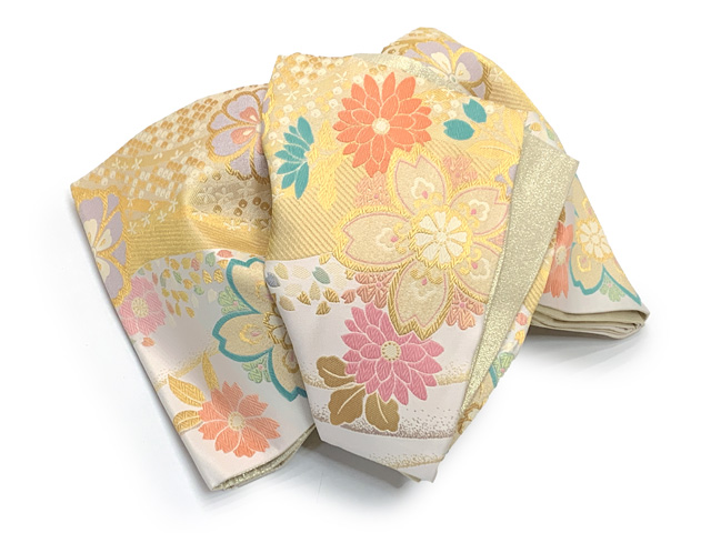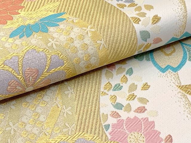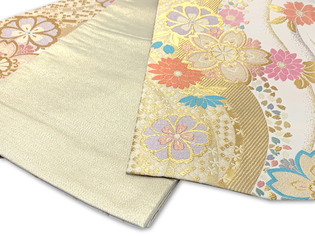 振袖用袋帯 成人式に 日本製 六通柄 華やかな柄の袋帯(合繊) 仕立て上がり【生成り系x金、桜】