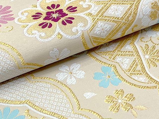 振袖用袋帯 成人式に 日本製 六通柄 華やかな柄の袋帯(合繊) 仕立て上がり【ゴールド系、華様紋】
