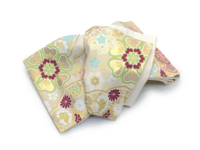 お手入れ簡単なポリエステル生地の振袖用袋帯です。仕立て上がり済ですので、すぐにお届けできます。
