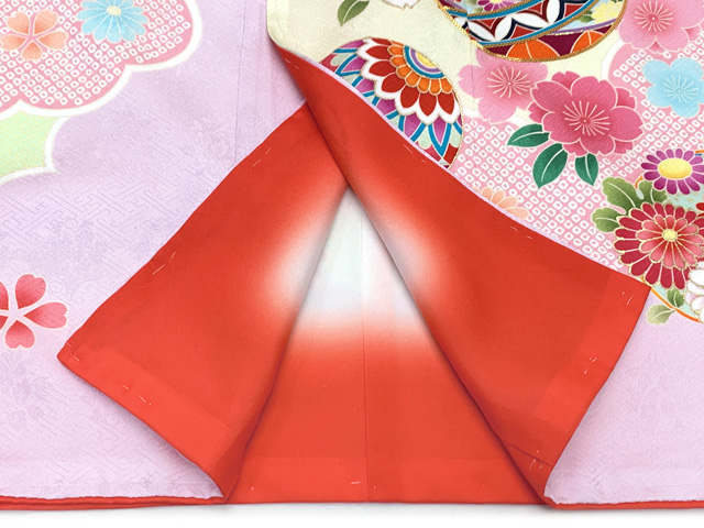 着物は小学生の女の子に人気の薄紫をメインにした色遣い、裾前の鞠には金駒刺繍が施されています。全体的に可愛さの中に昔ながらの伝統が生きている古典柄です。