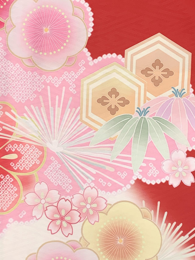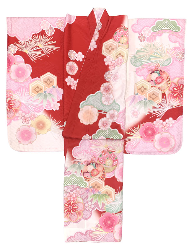七五三 着物 7歳 女の子 2025年新作 式部浪漫ブランド 絵羽柄の着物 四つ身 子供振袖 単品 合繊【赤、鞠梅】