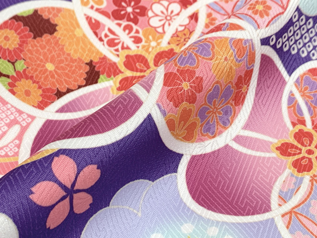 七五三 着物 7歳 女の子用 四つ身の着物と結び帯 他 コーディネート フルセット【紫、古典桜】