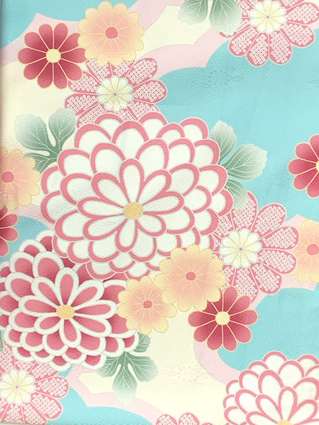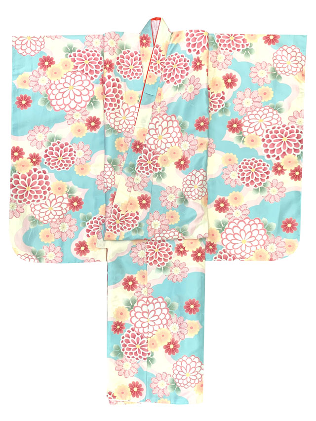 七五三 着物 7歳 女の子用 四つ身の着物と結び帯 他 コーディネート フルセット【水色x肌色、菊】