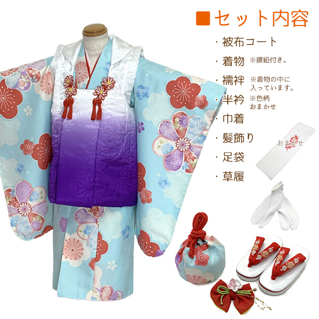 七五三 着物 3歳 女の子 フルセット 古典柄の着物 刺繍入りの被布コートセット【紫ぼかしx水色、古典柄】