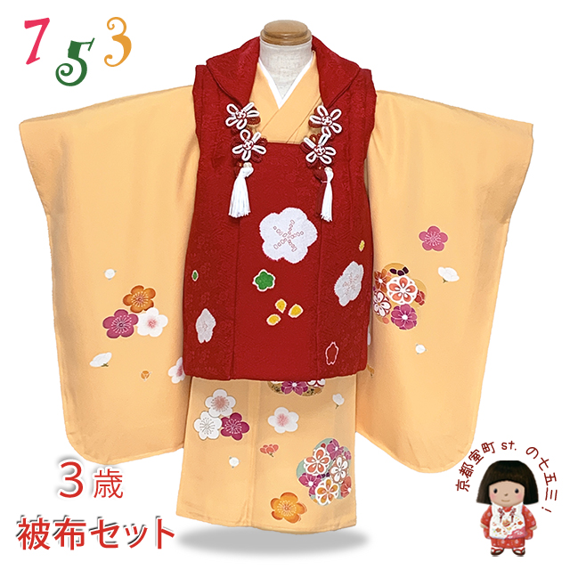 【ちょっと訳あり品】七五三 着物 3歳 正絹 フルセット 女の子 友禅 絵羽柄の着物 被布セット【赤x黄色、梅】 [OK3K2389-t893set]