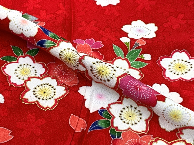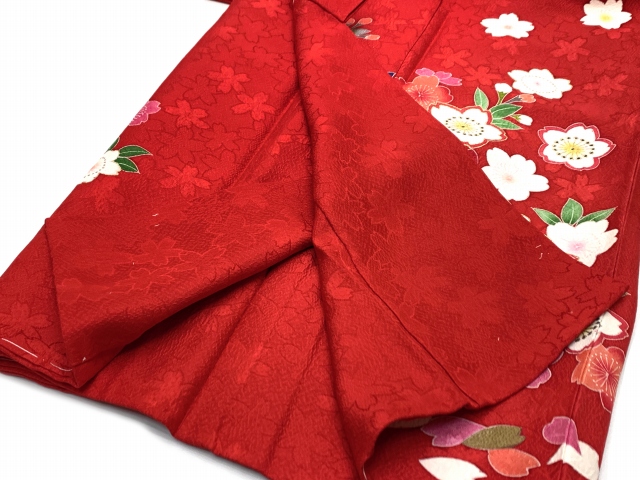 七五三 着物 3歳 女の子 フルセット 正絹 友禅柄 三つ身の絵羽着物 小寸結び帯・小物セット【赤、桜】