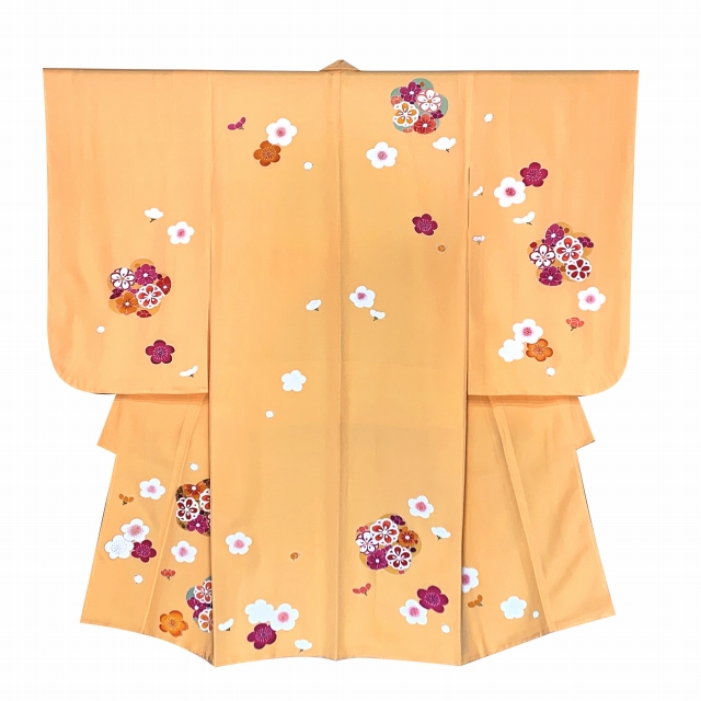 七五三 着物 3歳 女の子 フルセット 正絹 友禅柄 三つ身の絵羽着物 小寸結び帯・小物セット【黄色、梅】 [OK3K2389o2408KSHp]