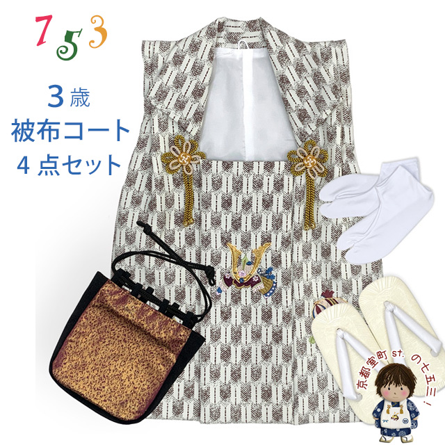 七五三 男の子 3歳 被布セット 被布コート 雪駄 信玄袋 足袋 4点コーデセット 合繊【生成り系、矢羽に兜と小槌】