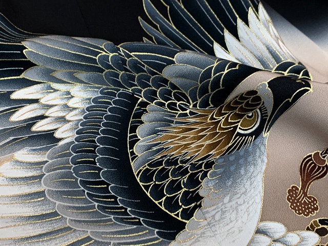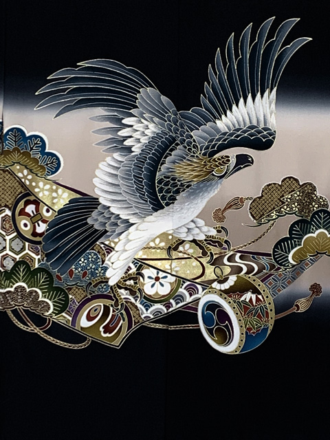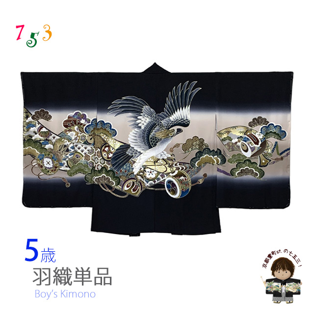 七五三 5歳 男の子 正絹の羽織 単品 日本製【黒地、鷹と鼓】