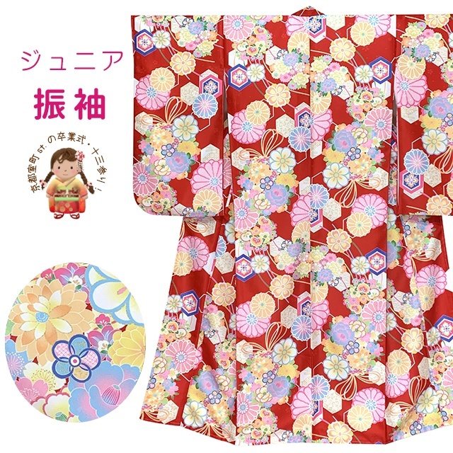 ジュニアサイズ 振袖 小紋柄 150サイズ 合繊 お正月 卒業式袴に【赤、古典柄】