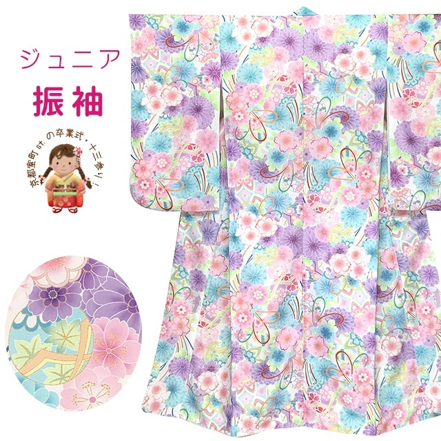 ジュニアサイズ 振袖 小紋柄 150サイズ 合繊 お正月 卒業式袴に【白地、紫x水色菊】 [JRFR873]