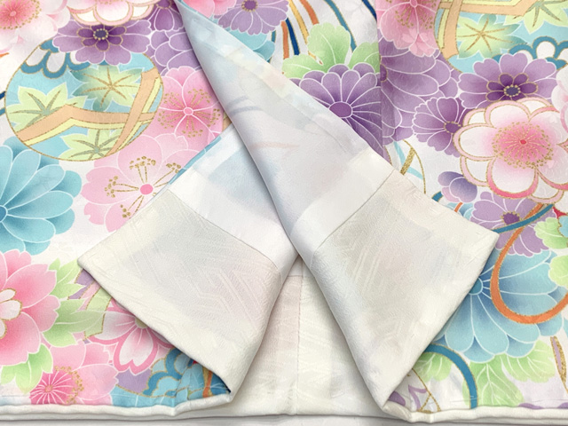ジュニアサイズ 振袖 小紋柄 150サイズ 合繊 お正月 卒業式袴に【白地、紫x水色菊】