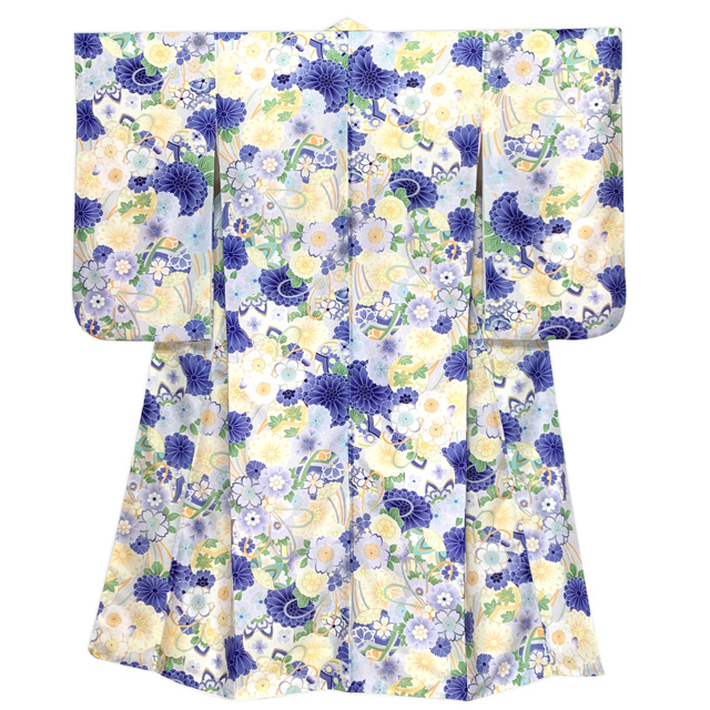 ジュニアサイズ 振袖 小紋柄 150サイズ 合繊 お正月 卒業式袴に【ブルーx淡イエロー系、万寿菊と水引き。鞠】 [JRFR876]