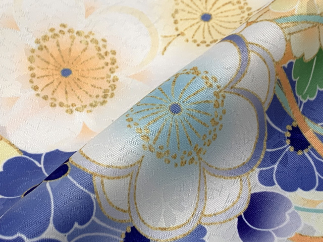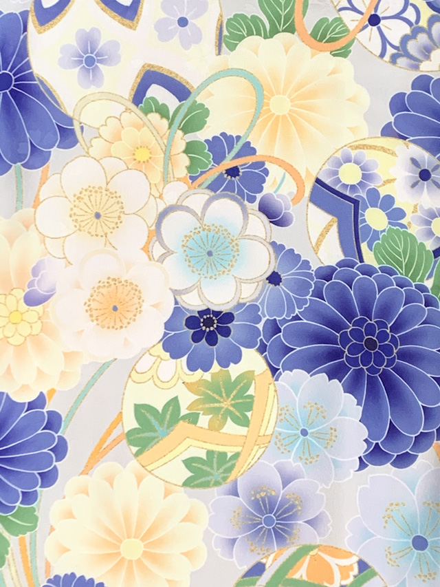 ジュニアサイズ 振袖 小紋柄 150サイズ 合繊 お正月 卒業式袴に【ブルーx淡イエロー系、万寿菊と水引き。鞠】