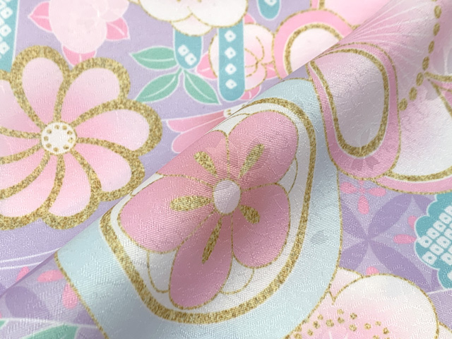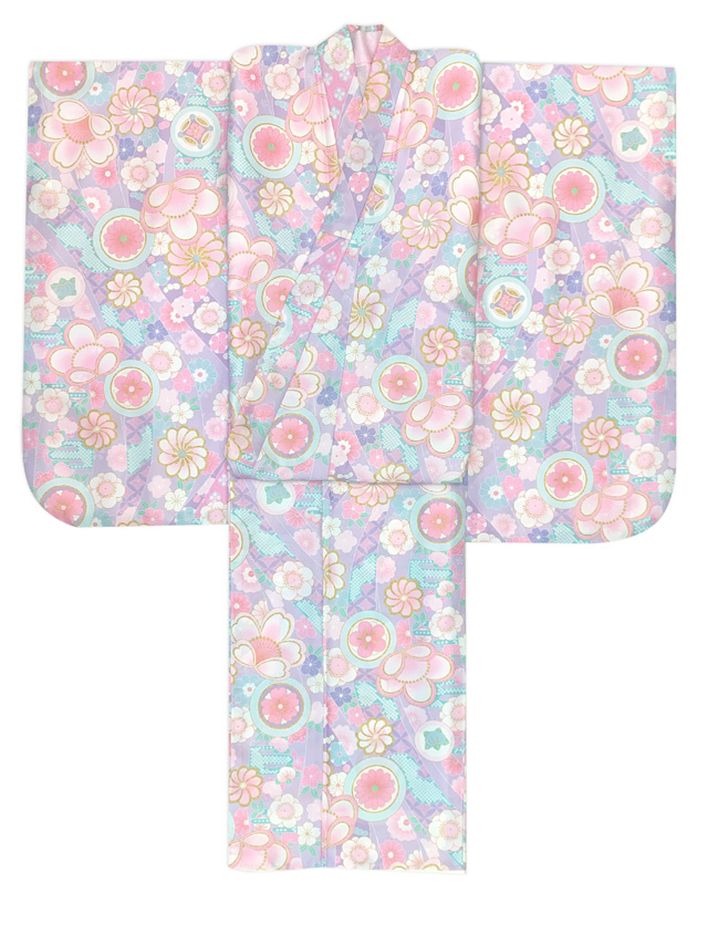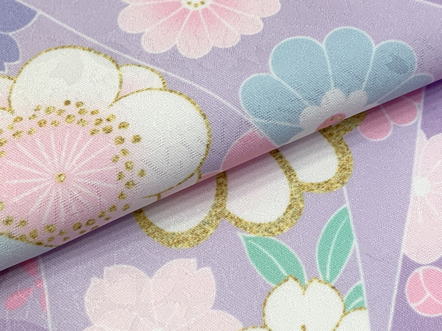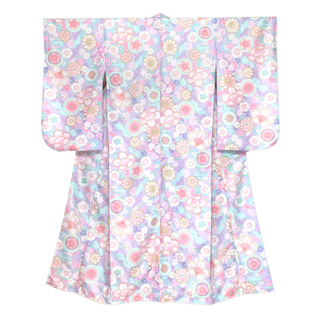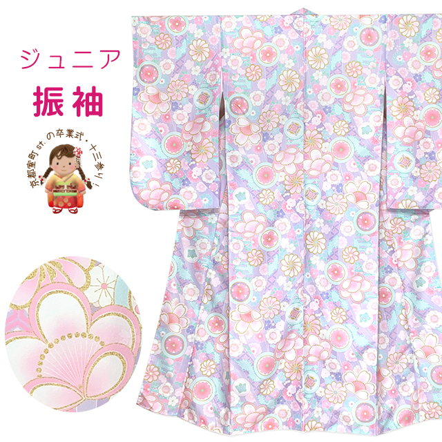 ジュニアサイズ 振袖 小紋柄 150サイズ 合繊 お正月 卒業式袴に【藤色xピンクx水色、熨斗】 [JRFR877]