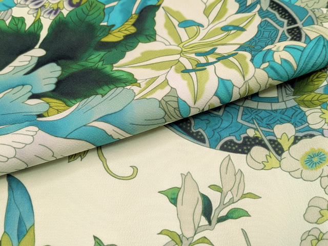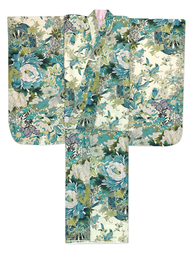 ジュニアサイズ 振袖 小紋柄 150サイズ 合繊 お正月 卒業式袴に【生成りx青緑系、花車】