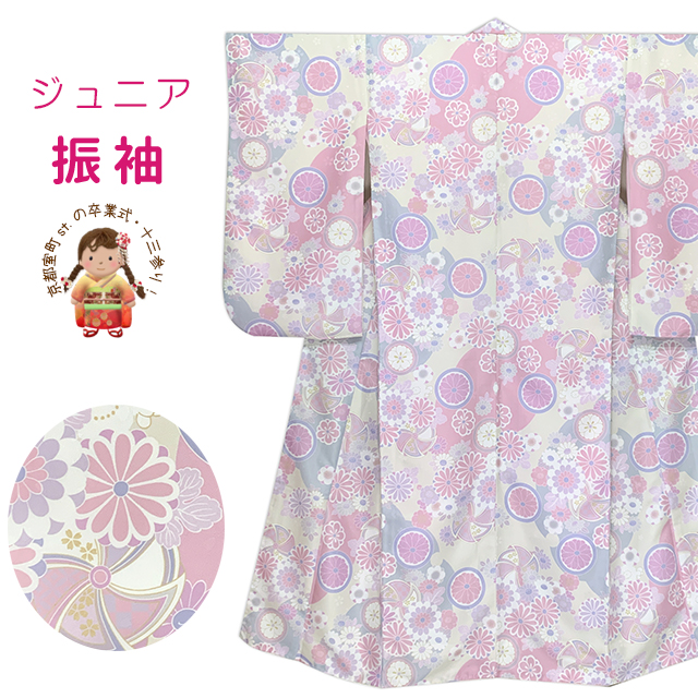 ジュニアサイズ 振袖 小紋柄 150サイズ 合繊 お正月 卒業式袴に【ベージュxピンク、パステル菊】 [JRFR879]
