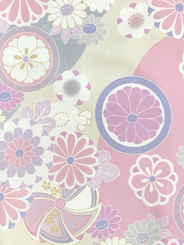 ジュニアサイズ 振袖 小紋柄 150サイズ 合繊 お正月 卒業式袴に【ベージュxピンク、パステル菊】