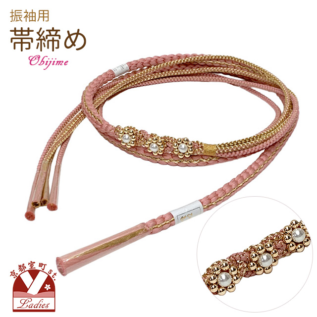 帯締め 振袖用 手組 パールビーズ飾り帯〆(正絹) 成人式 十三参りに【ピンク系xゴールド】