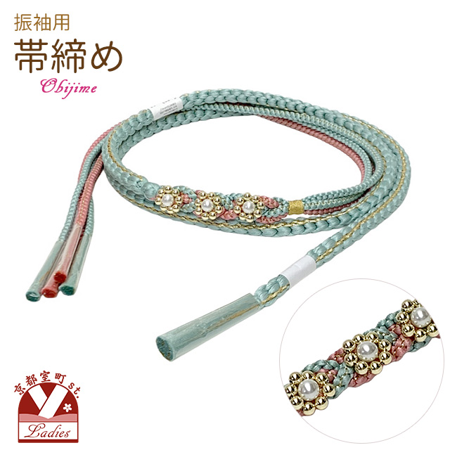帯締め 振袖用 手組 パールビーズ飾り帯〆(正絹) 成人式 十三参りに【水色系xピンク】 [FOJ581]