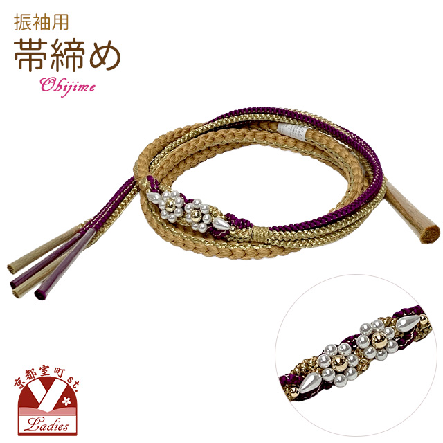 帯締め 振袖用 手組 パールビーズ飾り帯〆(正絹) 成人式 十三参りに【キャメルx紫】 [FOJ583]