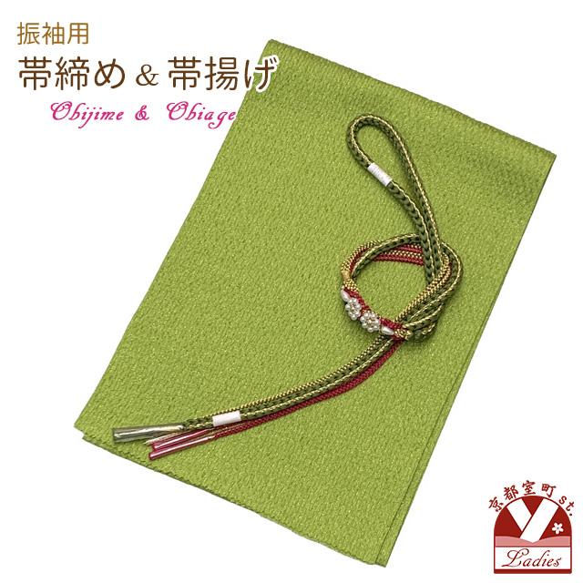 振袖用 帯揚げ 帯締め ポリエステルふくれ生地の帯揚げ パールビーズ飾りの振袖用帯〆 セット【ひわ色系】 [FOBset-709oj586]
