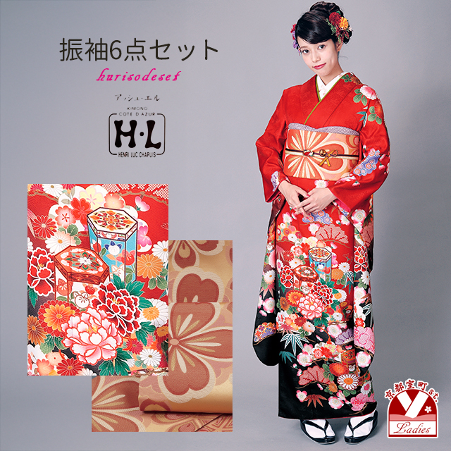 振袖 セット 成人式 正月 H・Lブランド 絵羽柄の振袖 袋帯 小物 6点セット【朱赤x黒、貝桶】 [HLfuriset-r-06br]