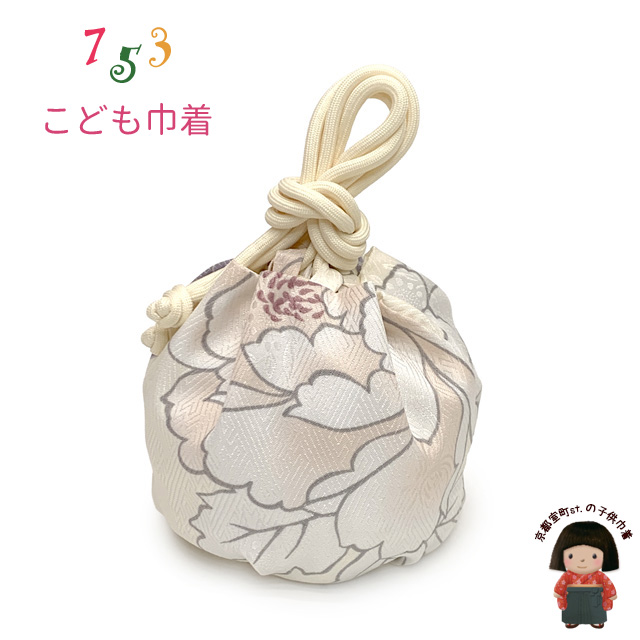 七五三 3歳 女の子 巾着 和柄巾着 こどもきんちゃく袋 単品【薄クリーム、牡丹】[OKIN-2514]