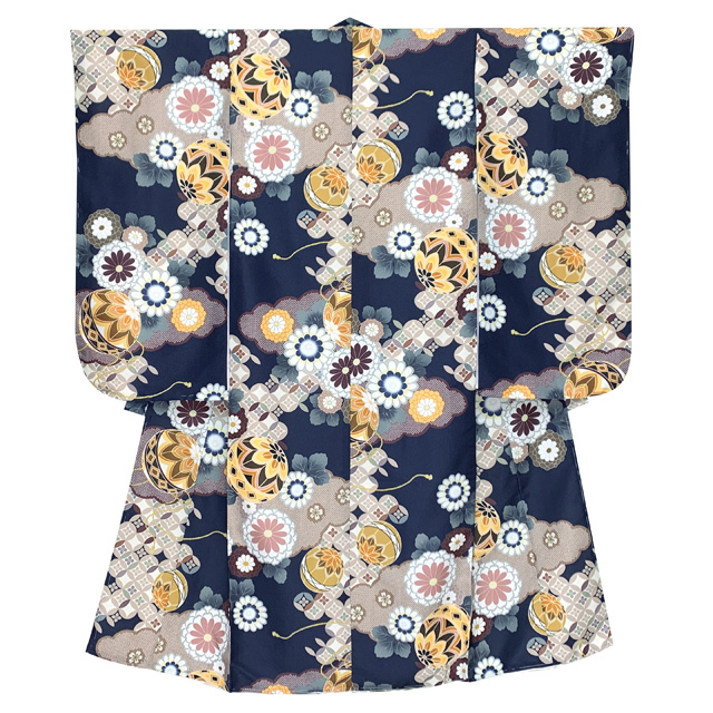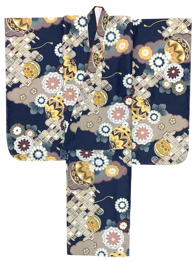 ホーム | 七五三 着物(女の子用) > 七五三 7歳 着物・振袖(合繊)七五三 着物 2025年新作 7歳 女の子用 小紋柄 四つ身 単品 子供着物(合繊) 襦袢付き【紺地、雲どりに鞠・菊】