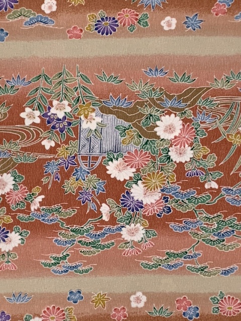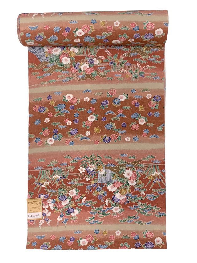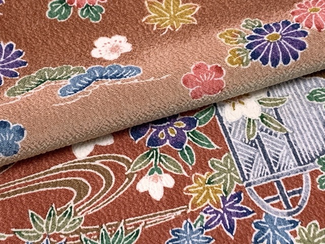 【アウトレット 美品】 反物 小紋 生地反物 東レ シルック ポリエステル 未仕立て ポリエステル 綸子【茶系ぼかし、茶屋ヶ辻】[KMN-R0040]