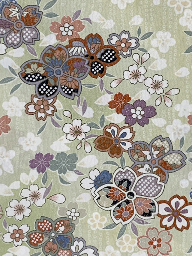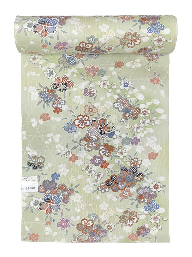 ホーム | 反物 着尺 > 洗える着物 小紋柄 反物【アウトレット 美品】 反物 小紋 生地反物 東レ シルック ポリエステル 未仕立て ポリエステル 綸子【薄抹茶色、古典桜】