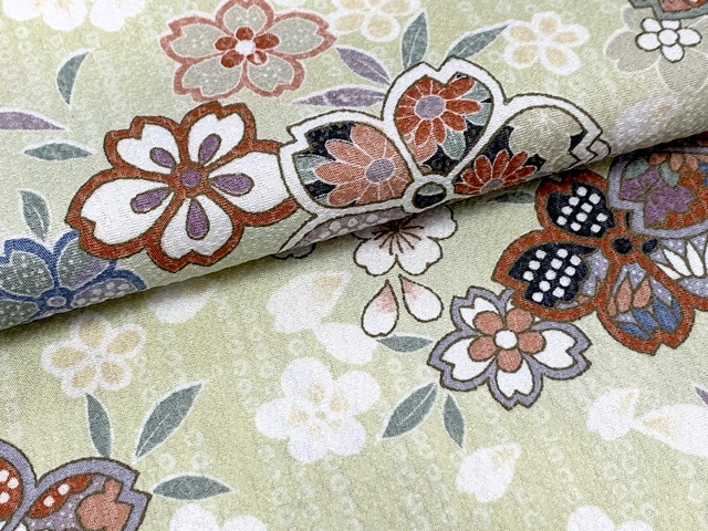 【アウトレット 美品】 反物 小紋 生地反物 東レ シルック ポリエステル 未仕立て ポリエステル 綸子【薄抹茶色、古典桜】[KMN-R0041]