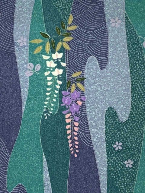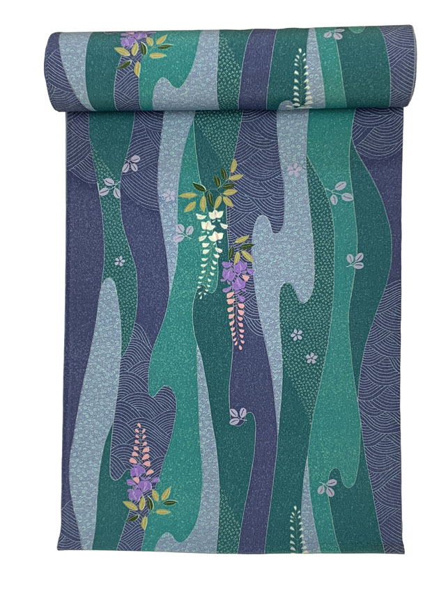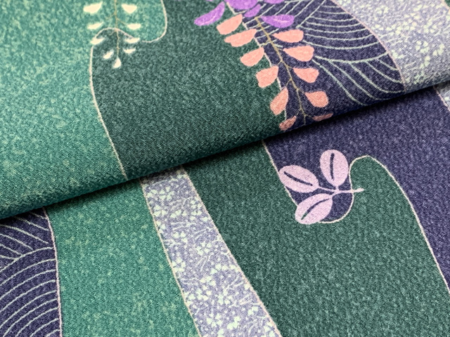 【アウトレット 美品】 反物 小紋 生地反物 東レ シルック ポリエステル 未仕立て ポリエステル 綸子【青系、藤と萩】[KMN-R0044]