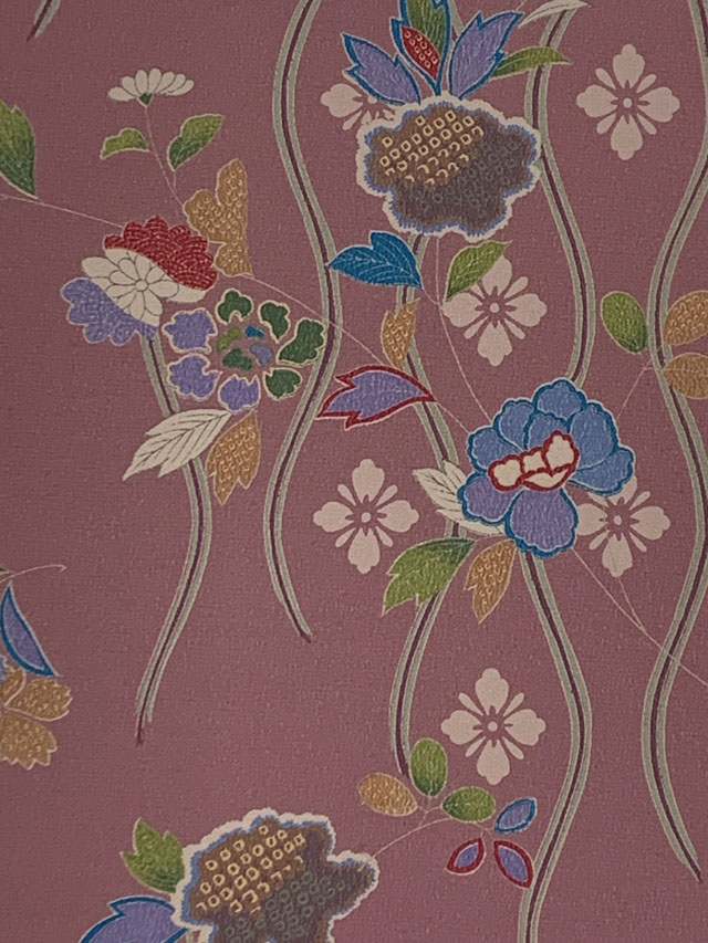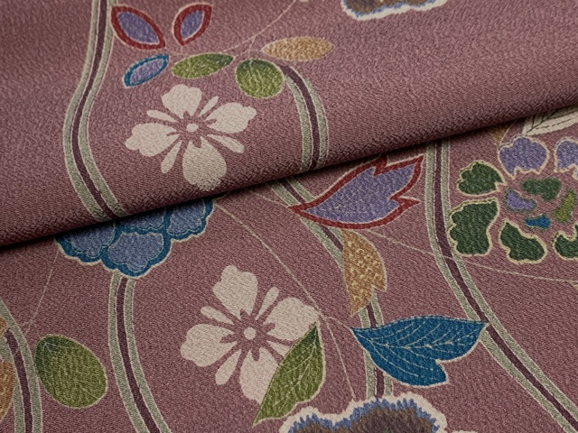 【アウトレット 美品】 反物 小紋 生地反物 東レ シルック ポリエステル 未仕立て ポリエステル 綸子【オールドローズ系、立涌に草花】[KMN-R0045]