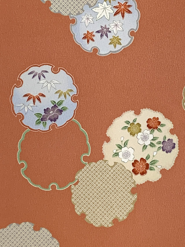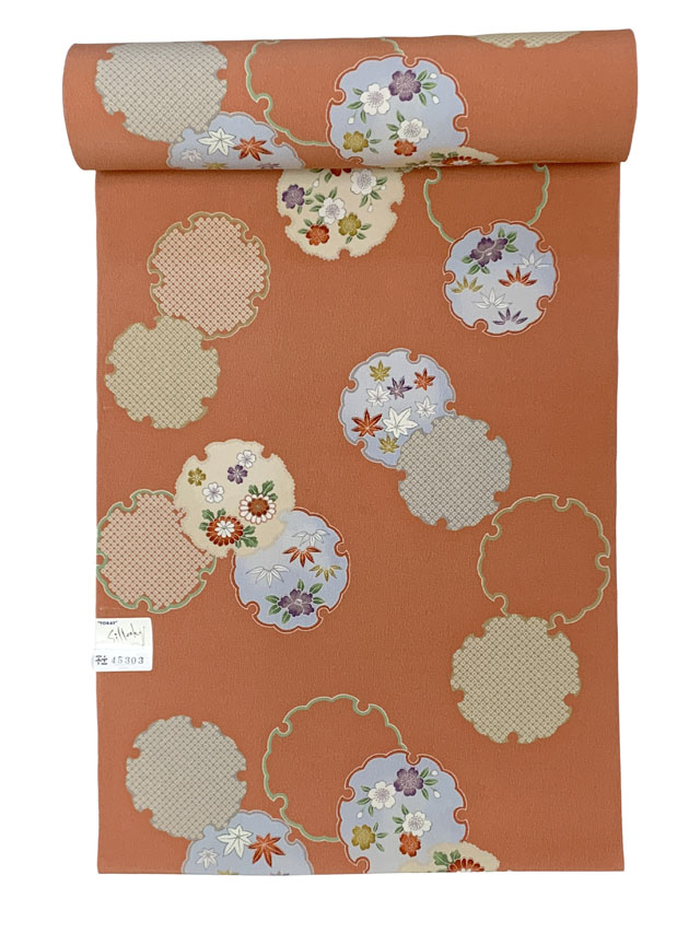 【アウトレット 美品】 反物 小紋 生地反物 東レ シルック ポリエステル 未仕立て ポリエステル 綸子【テラコッタ系、雪輪】[KMN-R0047]