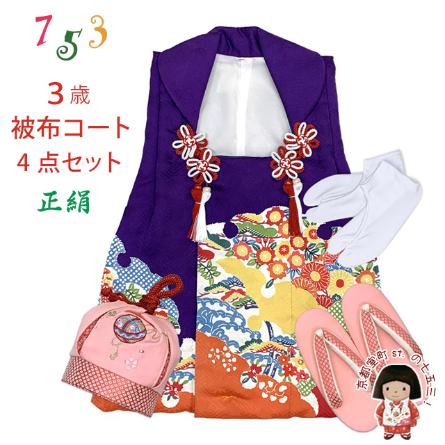 七五三 3歳 女の子 被布セット 正絹被布コート 草履 巾着 足袋 4点コーデセット【紫系、京紅型】[HHFK-03-4set01]