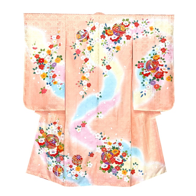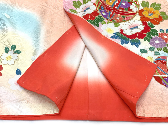 七五三 着物 7歳 セット 正絹 絵羽柄 日本製 正絹 手描き ぼかし染め 四つ身着物と結び帯 コーデセット【オレンジ系、鞠と牡丹】[IYS974i28-638GZ]