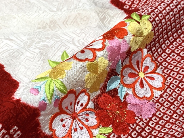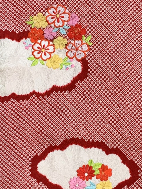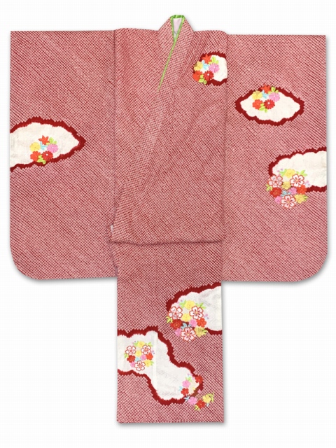 ホーム | 七五三 着物(女の子用) > 七五三 7歳 着物・振袖(正絹)七五三 着物 7歳 女の子 日本製 正絹 総絞り 総刺繍柄 絵羽付け 四つ身の着物【赤、雲に花輪】