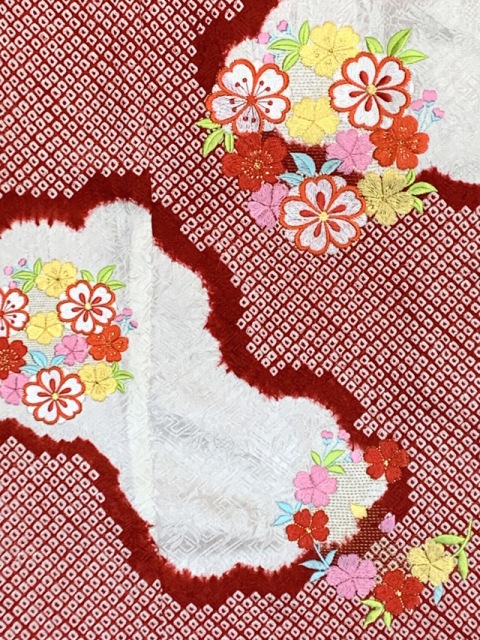 着物は総絞り(本絞り)、裾前には花輪の刺繍が入っています。