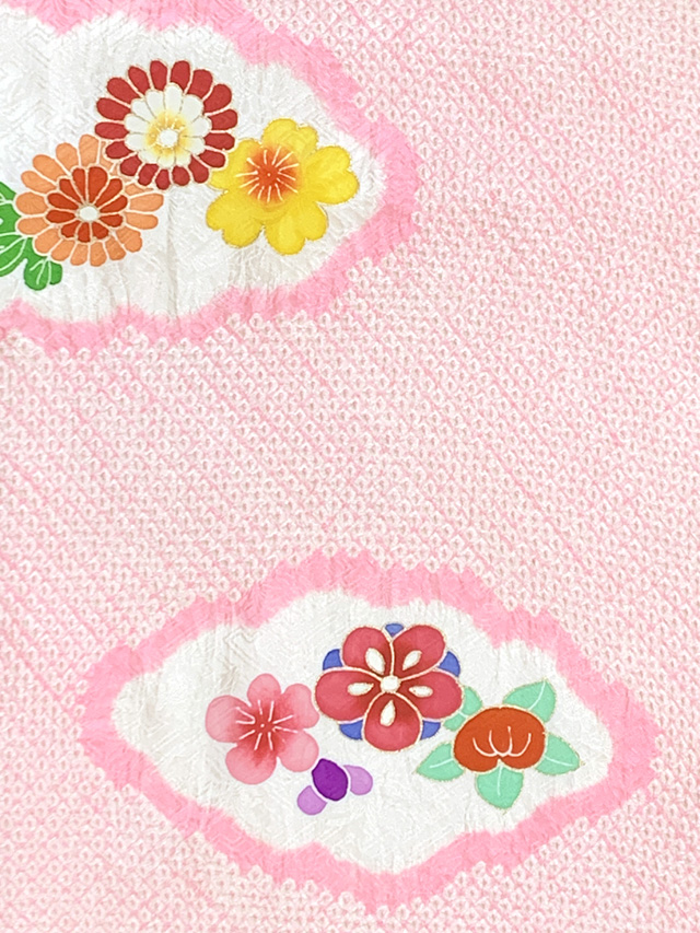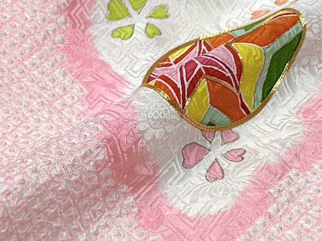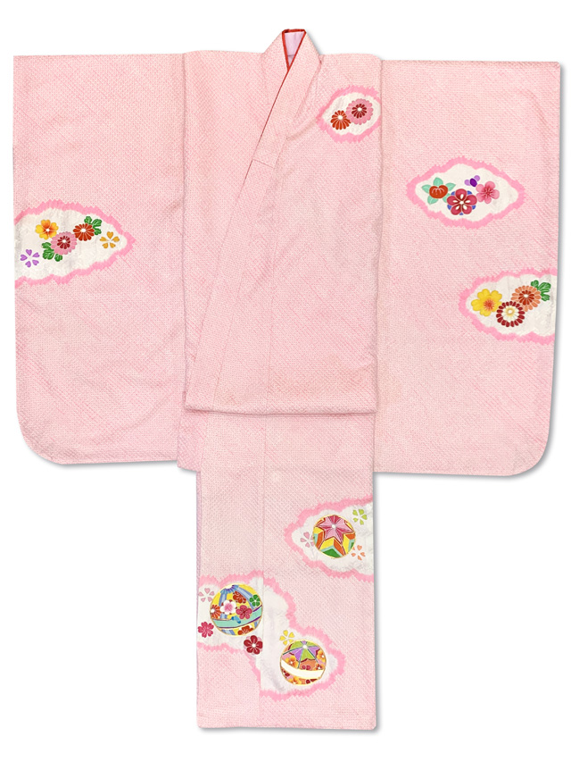 ホーム | 七五三 着物(女の子用) > 七五三 7歳 着物・振袖(正絹)七五三 着物 7歳 女の子 日本製 正絹 絞り染 本絞り 金駒刺繍 絵羽付け 四つ身の着物【ピンク、束ね熨斗】